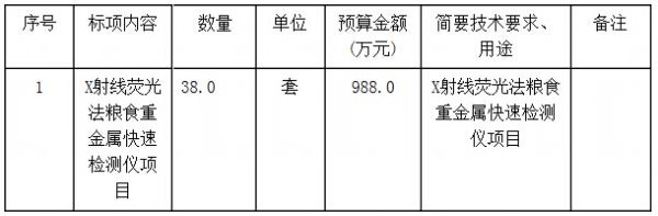 根據(jù)中國政府采購網(wǎng)4月16日消息,省糧食局(本級)就X射線熒光法糧食重金屬快速檢測儀項目進(jìn)行公開招標(biāo)(招標(biāo)項目編號:ZZCG2015S-GK-016),將采購38套X射線熒光法糧食重金屬快速檢測儀,預(yù)算988萬元。