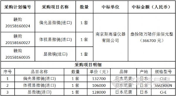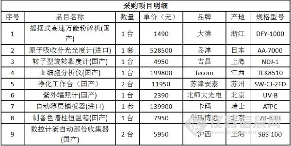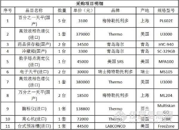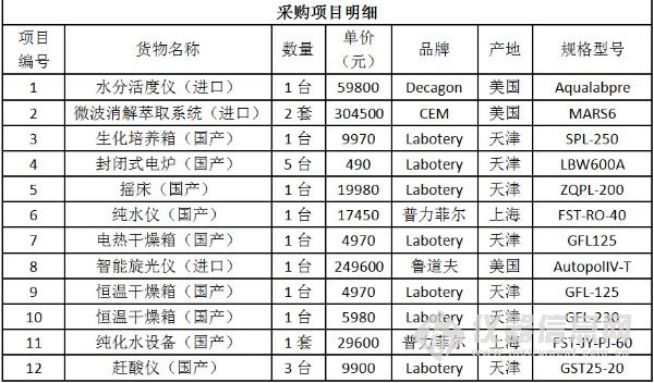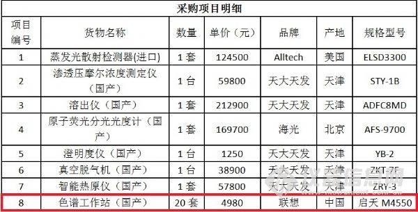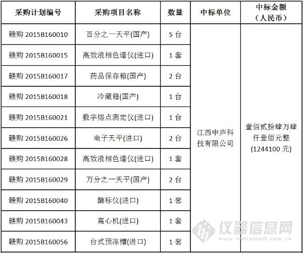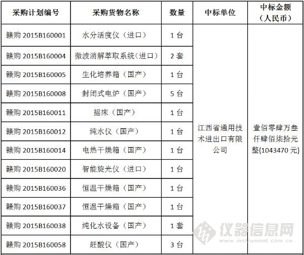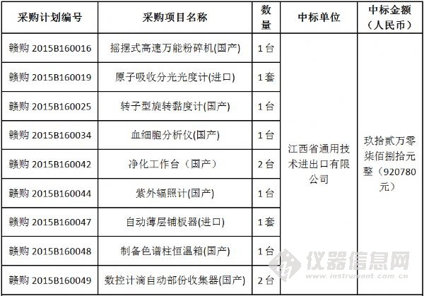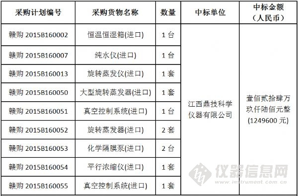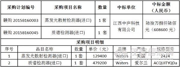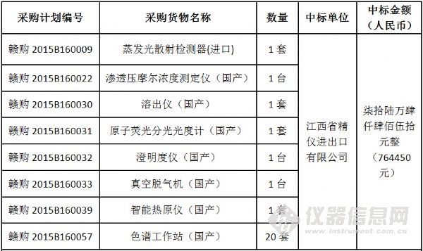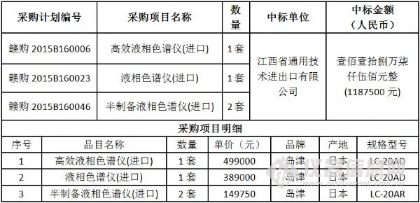 日前,江西省藥品檢驗(yàn)檢測研究院(原江西省食品藥品檢驗(yàn)所)食品藥品檢驗(yàn)機(jī)構(gòu)能力建設(shè)項(xiàng)目中標(biāo)結(jié)果公布。該項(xiàng)目共計(jì)采購了液相色譜儀等35套進(jìn)口儀器、原子熒光分光光度計(jì)等40套國產(chǎn)儀器以及20套國產(chǎn)色譜工作站,最終中標(biāo)總金額為824萬元。 不同以往儀器中標(biāo)公告的“猶抱琵琶半遮面”,該項(xiàng)目的中標(biāo)結(jié)果 “毫不吝嗇”地將所有的中標(biāo)產(chǎn)品品牌、型號(hào)、單價(jià)以及產(chǎn)地悉數(shù)列出,信息量巨大! 編輯:劉玉蘭 具體參加以下圖表: 招標(biāo)編號(hào):JXMD2015-C011-1