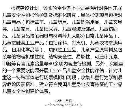 “六一”兒童節(jié)前夕,國(guó)家質(zhì)檢總局批復(fù)了天津檢驗(yàn)檢疫局關(guān)于籌建“國(guó)家質(zhì)檢總局工業(yè)產(chǎn)品兒童安全檢測(cè)區(qū)域性中心實(shí)驗(yàn)室(天津)”的申請(qǐng)。建成后,將成為天津市乃至我國(guó)北方地區(qū)第一個(gè)專業(yè)從事工業(yè)產(chǎn)品兒童安全檢測(cè)的綜合實(shí)驗(yàn)室。