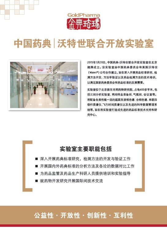 關(guān)于中國(guó)藥典-沃特世聯(lián)合開(kāi)放實(shí)驗(yàn)室 “中國(guó)藥典-沃特世聯(lián)合開(kāi)放實(shí)驗(yàn)室”是由國(guó)家藥典委員會(huì)以及沃特世公司共同建立的公益性聯(lián)合實(shí)驗(yàn)室。中國(guó)藥典-沃特世聯(lián)合開(kāi)放實(shí)驗(yàn)室將深入開(kāi)展藥典標(biāo)準(zhǔn)研究,檢測(cè)方法和開(kāi)發(fā)與驗(yàn)證工作,同時(shí)開(kāi)展國(guó)內(nèi)外藥典標(biāo)準(zhǔn)的分析方法,及各論的數(shù)據(jù)比對(duì)工作。實(shí)驗(yàn)室還將為藥品監(jiān)管及藥品生產(chǎn)科研人員提供培訓(xùn),并就藥物開(kāi)發(fā)研究開(kāi)展廣泛的國(guó)際間技術(shù)交流。