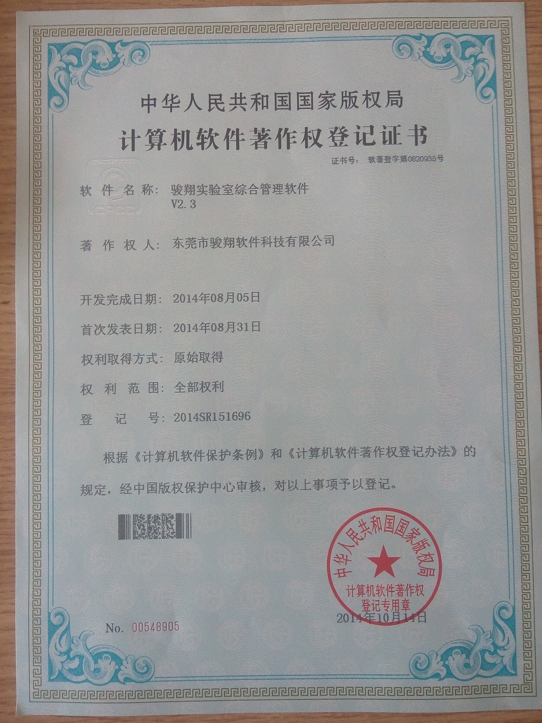駿翔實驗室管理系統(tǒng)著作權(quán)證書