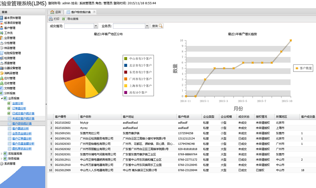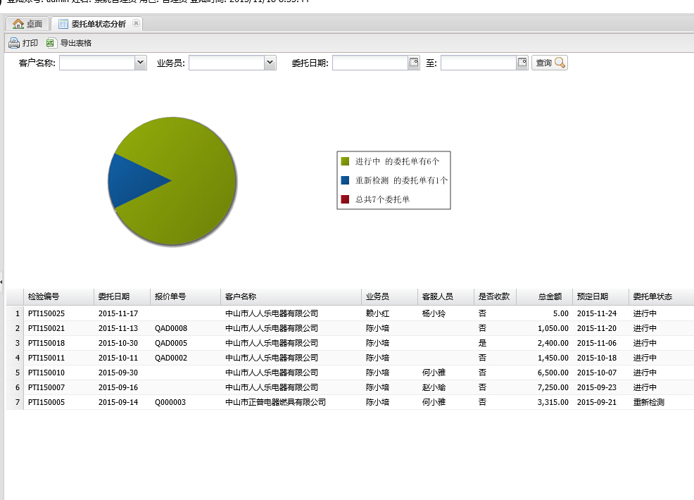 由業(yè)務(wù)報(bào)表、實(shí)驗(yàn)室報(bào)表、財(cái)務(wù)報(bào)表等功能模塊組成。樣品檢測(cè)匯總表、消耗品采購(gòu)、入庫(kù)匯總表,進(jìn)銷存匯總表、業(yè)績(jī)分析、客戶統(tǒng)計(jì)表、月度付款收款等多種報(bào)表可以根據(jù)需求靈活查詢所需數(shù)據(jù)。支持打印功能